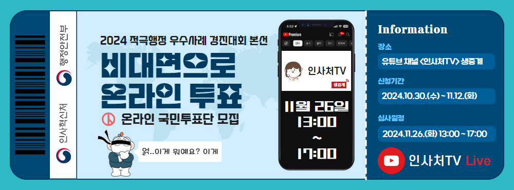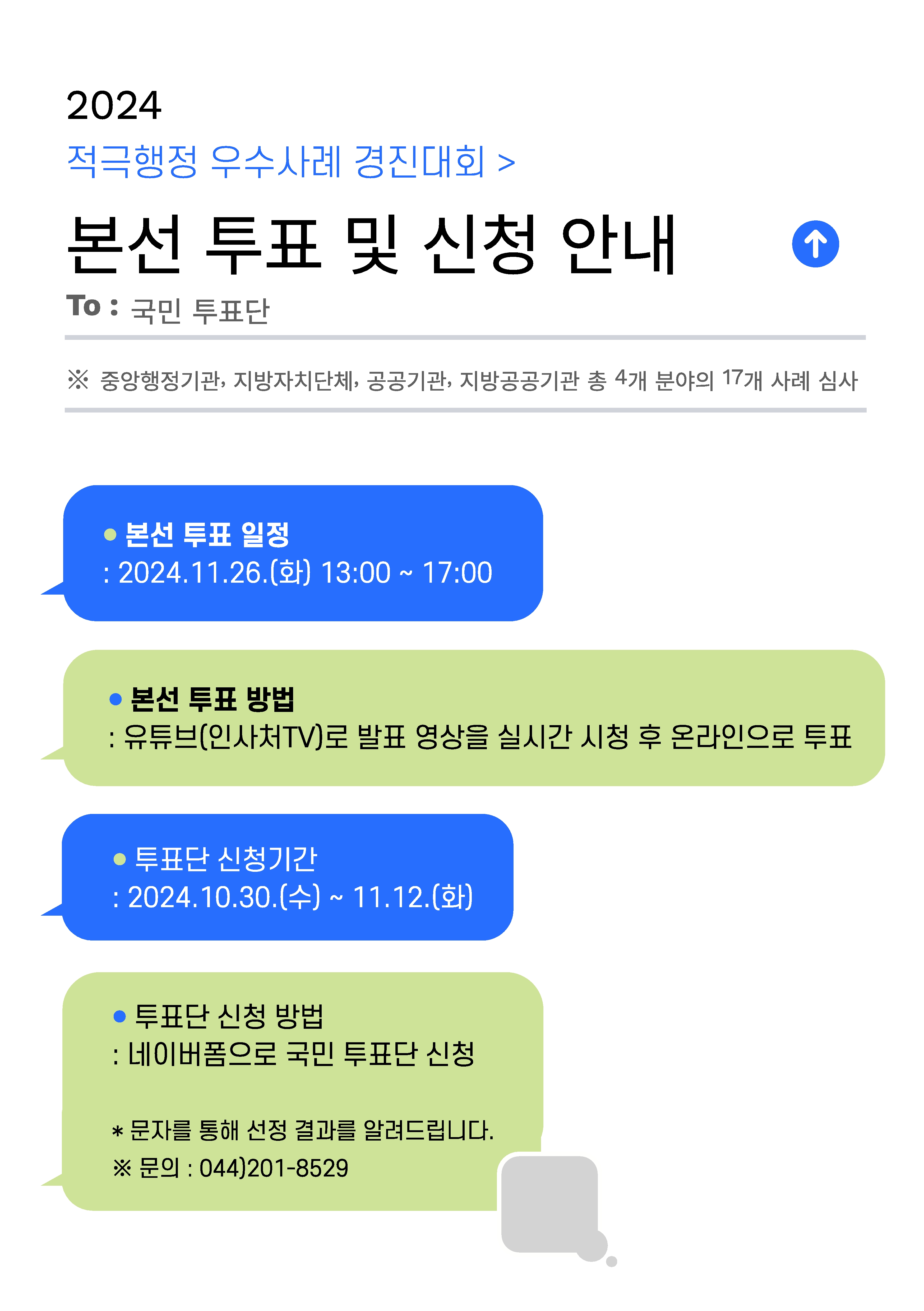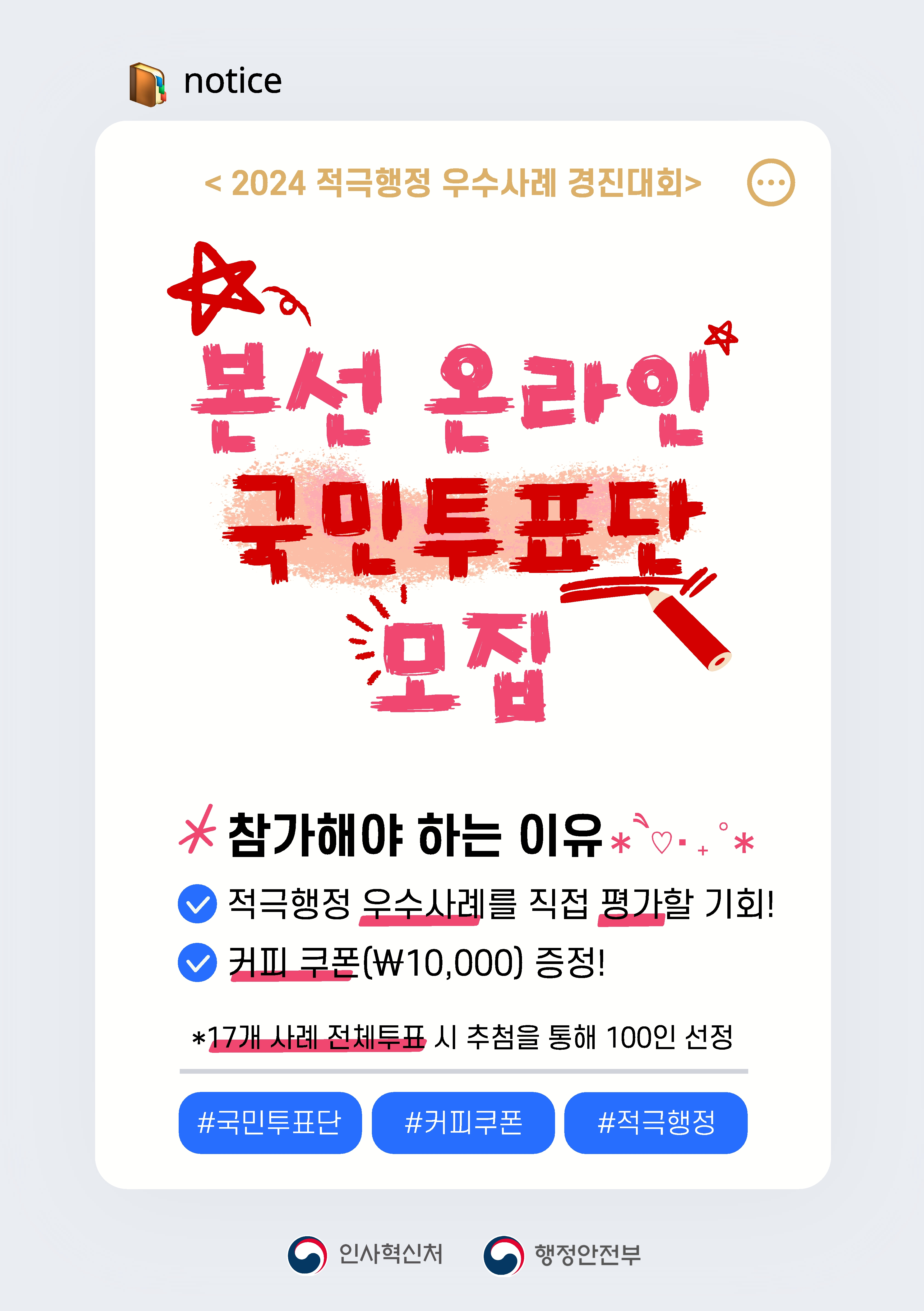 2024년 적극행정 우수사례 경진대회(국무조정실·행정안전부·인사혁신처 공동주관) 본선 온라인 투표단을 모집합니다.
